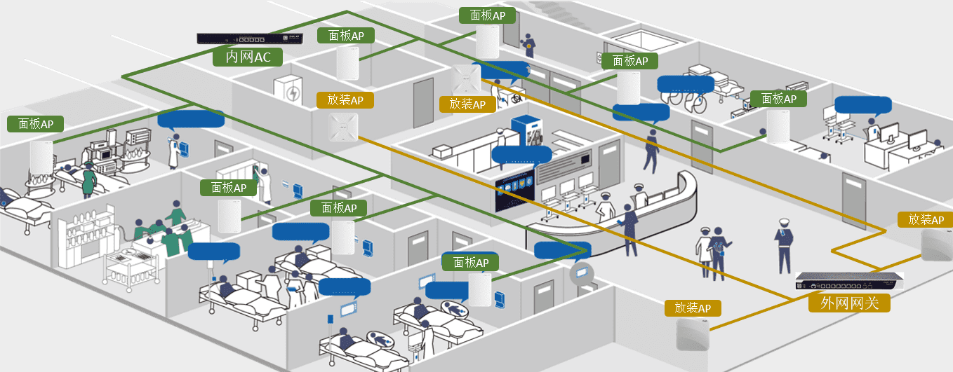 快速部署需求方艙醫(yī)院建設(shè)以速度快為主要特點(diǎn),應(yīng)保證供應(yīng)快、實(shí)施快,不能讓網(wǎng)絡(luò)實(shí)施拖了整體建設(shè)的后腿。無線接入質(zhì)量需求Internet出口應(yīng)滿足方艙醫(yī)院的醫(yī)患容量;如何保障在有限帶寬下,讓每個(gè)人都擁有公平網(wǎng)絡(luò)流量?如何應(yīng)對(duì)一些視頻類,大流量用戶問題?醫(yī)護(hù)人員和患者使用的手機(jī)品牌及價(jià)格不同,導(dǎo)致了具備的接入能力不同,如何為高中低端手機(jī)提供穩(wěn)定的WiFi接入更為關(guān)鍵;最后,要保障醫(yī)護(hù)人員和患者在移動(dòng)過程使用WiFi的良好上網(wǎng)體驗(yàn)?;A(chǔ)設(shè)施齊全需求方艙醫(yī)院網(wǎng)絡(luò)基礎(chǔ)系統(tǒng)設(shè)施應(yīng)該齊備,保證內(nèi)網(wǎng)業(yè)務(wù)正常運(yùn)轉(zhuǎn)及患者基本所需,不應(yīng)出現(xiàn)缺失設(shè)備情況,投入使用后難以補(bǔ)救,造成損失。安全隔離管理需求投入使用之后的方艙醫(yī)院,尤其是污染區(qū)的隔離病房,屬于高危區(qū)域,一旦設(shè)備出現(xiàn)故障,運(yùn)維人員一般很難到達(dá)現(xiàn)場(chǎng)進(jìn)行維護(hù),因此,網(wǎng)絡(luò)設(shè)備應(yīng)支持授權(quán)遠(yuǎn)程運(yùn)維的功能,保障運(yùn)維人員對(duì)內(nèi)網(wǎng)設(shè)備進(jìn)行遠(yuǎn)程維護(hù)、升級(jí)。監(jiān)控承載需求監(jiān)控承載方艙內(nèi)外的安全任務(wù),方艙醫(yī)院內(nèi)有大量監(jiān)控點(diǎn)位,對(duì)網(wǎng)絡(luò)的大流量承載能力提出需求。同時(shí),監(jiān)控點(diǎn)位的部署還要考慮醫(yī)患的隱私。