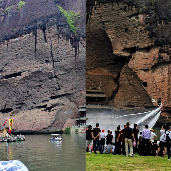 竹筏到了仙水巖景區(qū)前一段比較開闊的河面,我們也下了竹筏,觀看場景演出??罩酗w人的水上表演,上下翻滾,騰云駕霧,蛟龍出水,哄托了現(xiàn)場的整個氣氛。鸕鶿捕魚、采仙草、仿古升棺等表演,讓你在復原的場景中真正體會到傳統(tǒng)的勞作、勇敢的山民和未解的千年之謎的無窮奧妙。